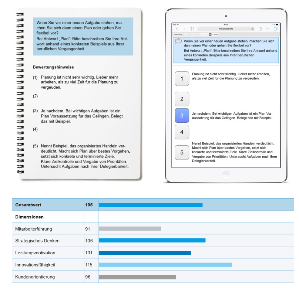 Ablauf: Das Multimodale Interview MMI® besteht aus acht Teilen und beinhaltet standardisierte Fragen, die allen Teilnehmern in gleicher Weise gestellt und um standardisierte Nachfragen ergänzt werden. Unmittelbar nach der Antwort erfolgt die Bewertung – so lassen sich Wahrnehmungsfehler minimieren. Verhaltensverankerte Bewertungsskalen im Interviewleitfaden, in denen sich die jeweilige Organisationskultur und das gewünschte Verhalten der Zielgruppe widerspiegeln, sichern eine hohe Objektivität in der Beurteilung der Antworten. Das dient der Fairness sowie der Rechtssicherheit und ermöglicht eine valide Entscheidungsbasis. Außerdem entlastet es die Interviewer – lange Mitschriebe sind Vergangenheit.